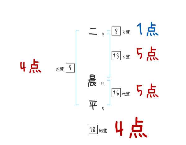 天運![]() | 二晨平さんの天運は2画の1つ星!優しいですが積極性や意思の強さに欠ける傾向があります。家庭環境の乱れに注意しましょう。 家系が持つ宿命的な運勢を表します。祖先から受け継いだ苗字ですので自分の力が及びません。家柄を象徴します。 |