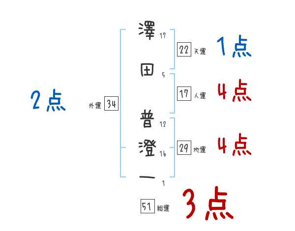外運![]() | 澤田普澄一さんの外運は34画の2つ星!独創性に優れるが、自尊心が強く災難に注意しましょう。 生活面を象徴する運勢です。外部から受ける影響力を表し、結婚運、家庭運や職場、環境への順応性を表します。 |