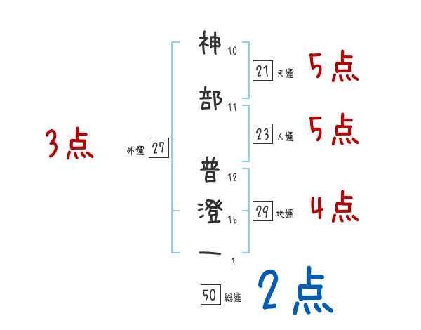 人運![]() | 神部普澄一さんの人運は23画の5つ星!想像力に優れ活力がある。一代で成功し名誉を手に入れる。 性格や才能などを表す2番目に重要な運勢です。人間関係や協調性、社会的な成功に影響します。主に20歳から50歳ぐらいまでの中年期の運勢を表します。 |