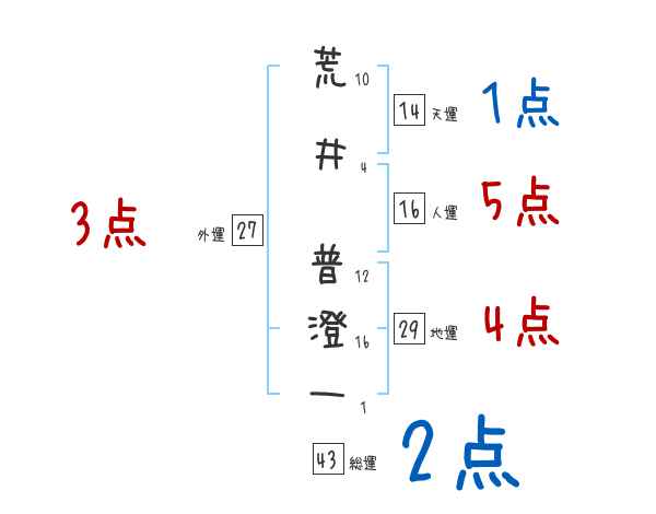 人運![]() | 荒井普澄一さんの人運は16画の5つ星!人望が厚く大きく発展する。逆転成功が見える。 性格や才能などを表す2番目に重要な運勢です。人間関係や協調性、社会的な成功に影響します。主に20歳から50歳ぐらいまでの中年期の運勢を表します。 |