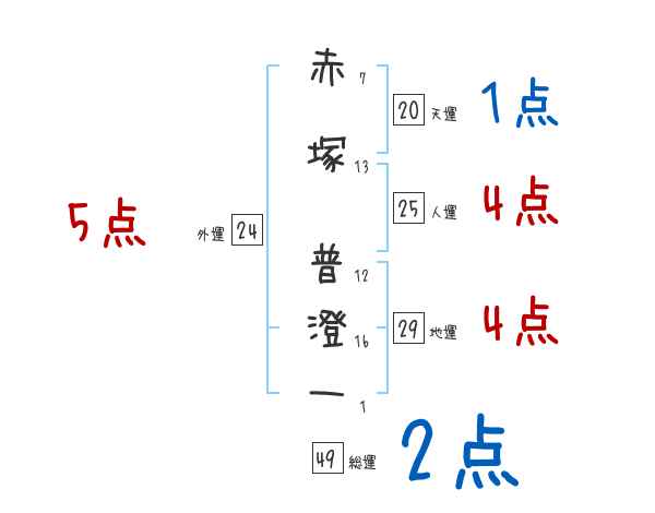 総運![]() | 赤塚普澄一さんの総運は49画の2つ星!不安定な性格で明暗がある人生。周りの人には支援されやすい。 あなたの人生を表す1番重要な運勢です。生涯を通じて影響する総合運となり、主に50歳以降の晩年期に影響を及ぼします。 |