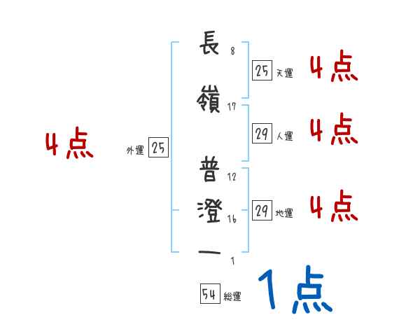 人運![]() | 長嶺普澄一さんの人運は29画の4つ星!完全主義で才能がある。厳格な心の持ち主。 性格や才能などを表す2番目に重要な運勢です。人間関係や協調性、社会的な成功に影響します。主に20歳から50歳ぐらいまでの中年期の運勢を表します。 |