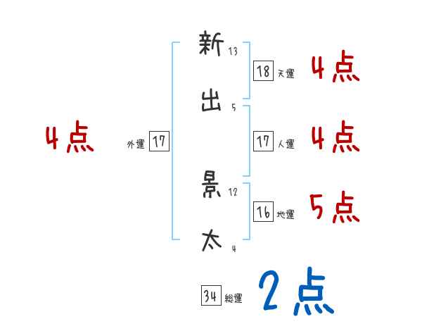 天運![]() | 新出景太さんの天運は18画の4つ星!情熱的で剛気。忍耐力があり信頼される。 家系が持つ宿命的な運勢を表します。祖先から受け継いだ苗字ですので自分の力が及びません。家柄を象徴します。 |