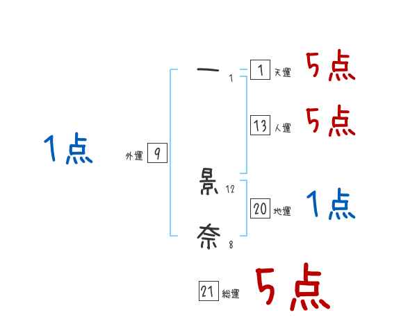 天運![]() | 一景奈さんの天運は1画の5つ星!行動力、指導力があり出世し繁栄する。幸運に恵まれる。 家系が持つ宿命的な運勢を表します。祖先から受け継いだ苗字ですので自分の力が及びません。家柄を象徴します。 |