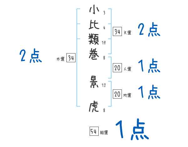 天運![]() | 小比類巻景虎さんの天運は34画の2つ星!独創性に優れるが、自尊心が強く災難に注意しましょう。 家系が持つ宿命的な運勢を表します。祖先から受け継いだ苗字ですので自分の力が及びません。家柄を象徴します。 |