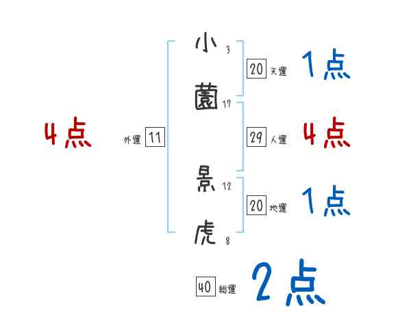人運![]() | 小薗景虎さんの人運は29画の4つ星!完全主義で才能がある。厳格な心の持ち主。 性格や才能などを表す2番目に重要な運勢です。人間関係や協調性、社会的な成功に影響します。主に20歳から50歳ぐらいまでの中年期の運勢を表します。 |