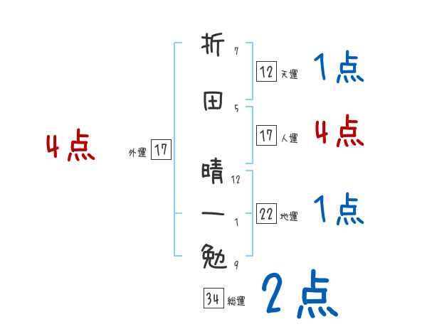 総運![]() | 折田晴一勉さんの総運は34画の2つ星!独創性に優れるが、自尊心が強く災難に注意しましょう。 あなたの人生を表す1番重要な運勢です。生涯を通じて影響する総合運となり、主に50歳以降の晩年期に影響を及ぼします。 |