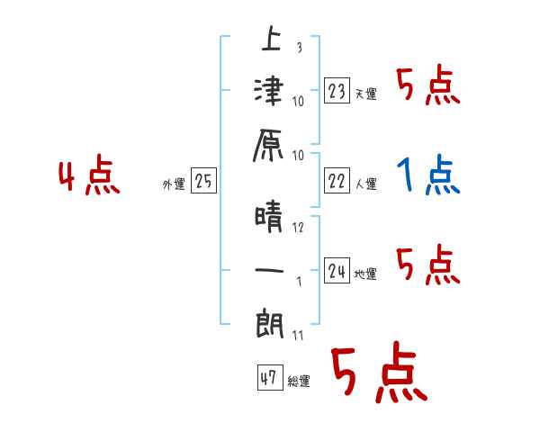 総運![]() | 上津原晴一朗さんの総運は47画の5つ星!実力が開花し発展する円満な人生。財に恵まれる。 あなたの人生を表す1番重要な運勢です。生涯を通じて影響する総合運となり、主に50歳以降の晩年期に影響を及ぼします。 |