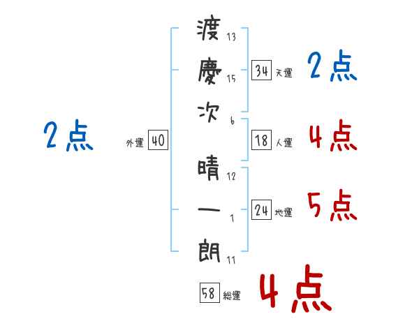 天運![]() | 渡慶次晴一朗さんの天運は34画の2つ星!独創性に優れるが、自尊心が強く災難に注意しましょう。 家系が持つ宿命的な運勢を表します。祖先から受け継いだ苗字ですので自分の力が及びません。家柄を象徴します。 |