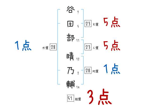 天運![]() | 谷田部晴乃輔さんの天運は23画の5つ星!想像力に優れ活力がある。一代で成功し名誉を手に入れる。 家系が持つ宿命的な運勢を表します。祖先から受け継いだ苗字ですので自分の力が及びません。家柄を象徴します。 |