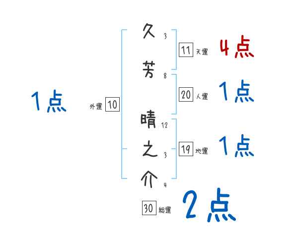 天運![]() | 久芳晴之介さんの天運は11画の4つ星!着実に富や地位を得る幸運な人生。 家系が持つ宿命的な運勢を表します。祖先から受け継いだ苗字ですので自分の力が及びません。家柄を象徴します。 |