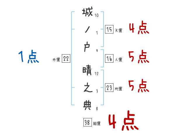 天運![]() | 城ノ戸晴之典さんの天運は15画の4つ星!人徳があり出世する。順調に物事を進め円満な人生。 家系が持つ宿命的な運勢を表します。祖先から受け継いだ苗字ですので自分の力が及びません。家柄を象徴します。 |