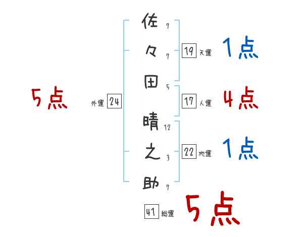 外運![]() | 佐々田晴之助さんの外運は24画の5つ星!家庭運が良く順調な人生。金運にも恵まれる。 生活面を象徴する運勢です。外部から受ける影響力を表し、結婚運、家庭運や職場、環境への順応性を表します。 |
