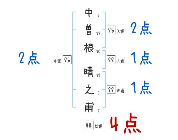 | 天運  | 中曽根晴之甫さんの天運は26画の2つ星!波瀾万丈かも。信頼できる人を大事にしましょう。家系が持つ宿命的な運勢を表します。祖先から受け継いだ苗字ですので自分の力が及びません。家柄を象徴します。 |