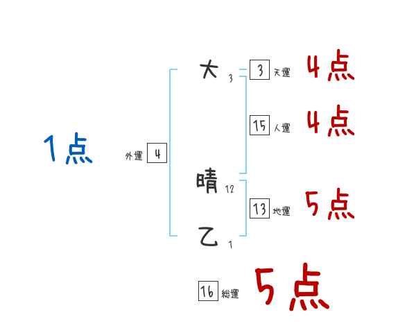 天運![]() | 大晴乙さんの天運は3画の4つ星!活動的で才能に恵まれ、多くの信頼を得る。希望に満ち成長する。 家系が持つ宿命的な運勢を表します。祖先から受け継いだ苗字ですので自分の力が及びません。家柄を象徴します。 |