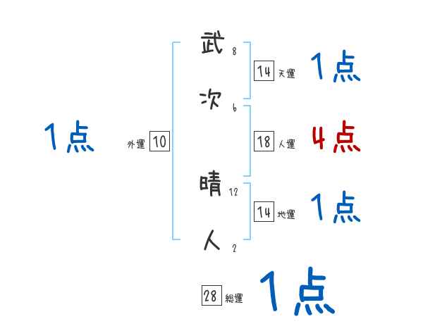 人運![]() | 武次晴人さんの人運は18画の4つ星!情熱的で剛気。忍耐力があり信頼される。 性格や才能などを表す2番目に重要な運勢です。人間関係や協調性、社会的な成功に影響します。主に20歳から50歳ぐらいまでの中年期の運勢を表します。 |