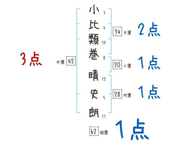 地運![]() | 小比類巻晴史朗さんの地運は28画の1つ星!家庭環境に注意。スポーツで活躍できる能力があるかも。 個性を表す基礎的な運勢です。性格形成や対人関係、行動力など家庭環境に影響されます。主に誕生してから20歳くらいまでの若年期の運勢を表します。 |