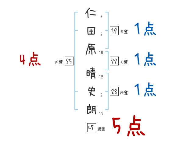 人運![]() | 仁田原晴史朗さんの人運は22画の1つ星!努力することが苦手ないっぽう手先が器用。芸術性にも優れる。 性格や才能などを表す2番目に重要な運勢です。人間関係や協調性、社会的な成功に影響します。主に20歳から50歳ぐらいまでの中年期の運勢を表します。 |