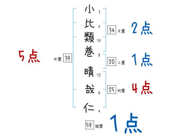 外運![]() | 小比類巻晴哉仁さんの外運は39画の5つ星!社交性に優れ人望が厚い。人の上に立ち成功する。 生活面を象徴する運勢です。外部から受ける影響力を表し、結婚運、家庭運や職場、環境への順応性を表します。 |