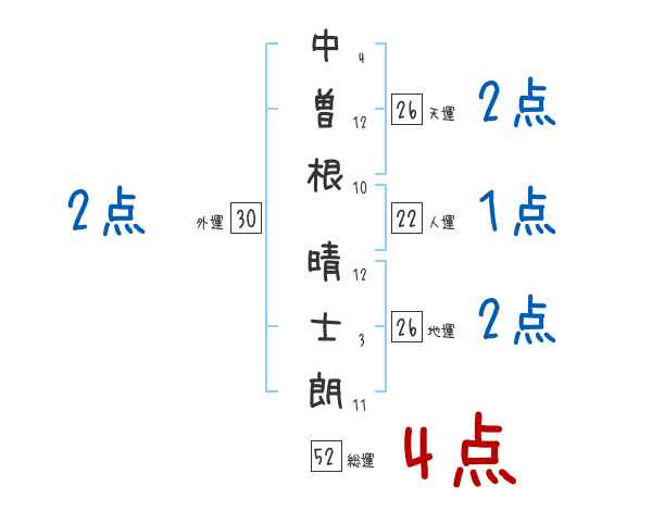人運![]() | 中曽根晴士朗さんの人運は22画の1つ星!努力することが苦手ないっぽう手先が器用。芸術性にも優れる。 性格や才能などを表す2番目に重要な運勢です。人間関係や協調性、社会的な成功に影響します。主に20歳から50歳ぐらいまでの中年期の運勢を表します。 |