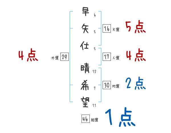 天運![]() | 早矢仕晴希望さんの天運は16画の5つ星!人望が厚く大きく発展する。逆転成功が見える。 家系が持つ宿命的な運勢を表します。祖先から受け継いだ苗字ですので自分の力が及びません。家柄を象徴します。 |