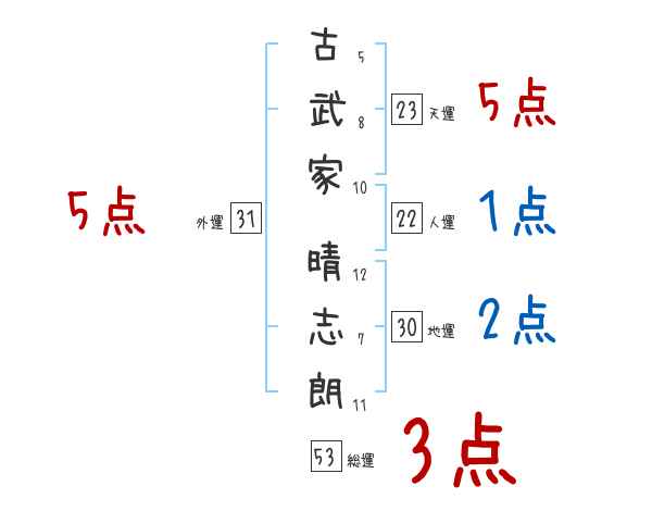 天運![]() | 古武家晴志朗さんの天運は23画の5つ星!想像力に優れ活力がある。一代で成功し名誉を手に入れる。 家系が持つ宿命的な運勢を表します。祖先から受け継いだ苗字ですので自分の力が及びません。家柄を象徴します。 |