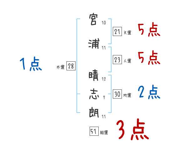 人運![]() | 宮浦晴志朗さんの人運は23画の5つ星!想像力に優れ活力がある。一代で成功し名誉を手に入れる。 性格や才能などを表す2番目に重要な運勢です。人間関係や協調性、社会的な成功に影響します。主に20歳から50歳ぐらいまでの中年期の運勢を表します。 |