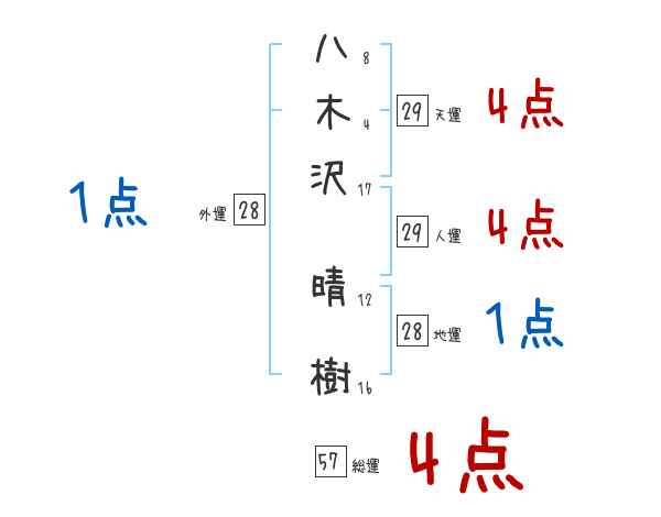 人運![]() | 八木沢晴樹さんの人運は29画の4つ星!完全主義で才能がある。厳格な心の持ち主。 性格や才能などを表す2番目に重要な運勢です。人間関係や協調性、社会的な成功に影響します。主に20歳から50歳ぐらいまでの中年期の運勢を表します。 |