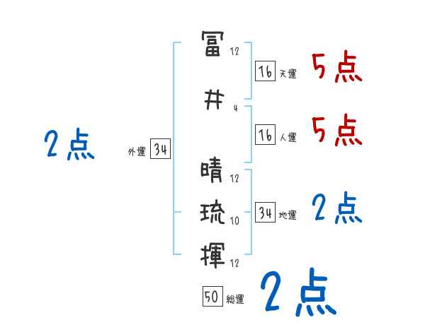 天運![]() | 冨井晴琉揮さんの天運は16画の5つ星!人望が厚く大きく発展する。逆転成功が見える。 家系が持つ宿命的な運勢を表します。祖先から受け継いだ苗字ですので自分の力が及びません。家柄を象徴します。 |