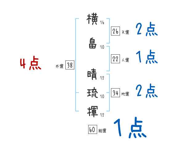 天運![]() | 横畠晴琉揮さんの天運は26画の2つ星!波瀾万丈かも。信頼できる人を大事にしましょう。 家系が持つ宿命的な運勢を表します。祖先から受け継いだ苗字ですので自分の力が及びません。家柄を象徴します。 |