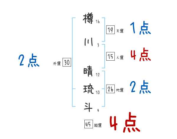 総運![]() | 樽川晴琉斗さんの総運は45画の4つ星!もくもくと物事を進め達成する。地味な努力家。 あなたの人生を表す1番重要な運勢です。生涯を通じて影響する総合運となり、主に50歳以降の晩年期に影響を及ぼします。 |