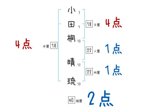 外運![]() | 小田桐晴琉さんの外運は18画の4つ星!情熱的で剛気。忍耐力があり信頼される。 生活面を象徴する運勢です。外部から受ける影響力を表し、結婚運、家庭運や職場、環境への順応性を表します。 |