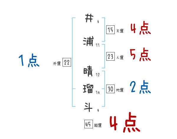 総運![]() | 井浦晴瑠斗さんの総運は45画の4つ星!もくもくと物事を進め達成する。地味な努力家。 あなたの人生を表す1番重要な運勢です。生涯を通じて影響する総合運となり、主に50歳以降の晩年期に影響を及ぼします。 |
