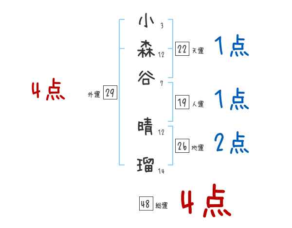 外運![]() | 小森谷晴瑠さんの外運は29画の4つ星!完全主義で才能がある。厳格な心の持ち主。 生活面を象徴する運勢です。外部から受ける影響力を表し、結婚運、家庭運や職場、環境への順応性を表します。 |