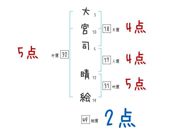外運![]() | 大宮司晴絵さんの外運は32画の5つ星!柔軟性があり成功する。チャンスが多く金運が良い。 生活面を象徴する運勢です。外部から受ける影響力を表し、結婚運、家庭運や職場、環境への順応性を表します。 |
