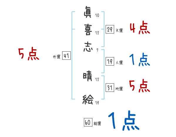 天運![]() | 眞喜志晴絵さんの天運は29画の4つ星!完全主義で才能がある。厳格な心の持ち主。 家系が持つ宿命的な運勢を表します。祖先から受け継いだ苗字ですので自分の力が及びません。家柄を象徴します。 |