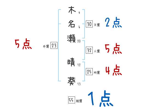 人運![]() | 木名瀬晴葵さんの人運は32画の5つ星!柔軟性があり成功する。チャンスが多く金運が良い。 性格や才能などを表す2番目に重要な運勢です。人間関係や協調性、社会的な成功に影響します。主に20歳から50歳ぐらいまでの中年期の運勢を表します。 |