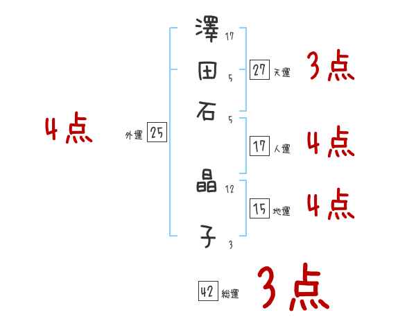総運![]() | 澤田石晶子さんの総運は42画の3つ星!病気に注意。多芸であるが消極的でおとなしい。 あなたの人生を表す1番重要な運勢です。生涯を通じて影響する総合運となり、主に50歳以降の晩年期に影響を及ぼします。 |