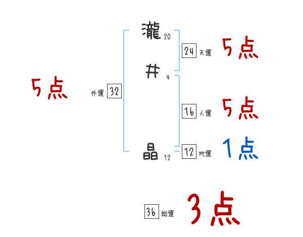 外運![]() | 瀧井晶さんの外運は32画の5つ星!柔軟性があり成功する。チャンスが多く金運が良い。 生活面を象徴する運勢です。外部から受ける影響力を表し、結婚運、家庭運や職場、環境への順応性を表します。 |