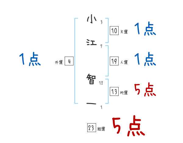 総運![]() | 小江智一さんの総運は23画の5つ星!想像力に優れ活力がある。一代で成功し名誉を手に入れる。 あなたの人生を表す1番重要な運勢です。生涯を通じて影響する総合運となり、主に50歳以降の晩年期に影響を及ぼします。 |