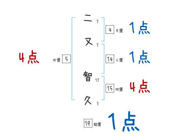 外運![]() | 二又智久さんの外運は5画の4つ星!健康で安泰。協調性に優れ、財産に恵まれる。 生活面を象徴する運勢です。外部から受ける影響力を表し、結婚運、家庭運や職場、環境への順応性を表します。 |