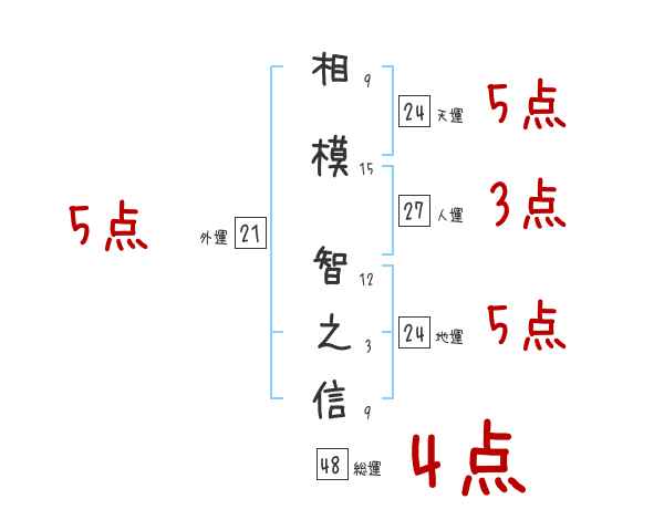 天運![]() | 相模智之信さんの天運は24画の5つ星!家庭運が良く順調な人生。金運にも恵まれる。 家系が持つ宿命的な運勢を表します。祖先から受け継いだ苗字ですので自分の力が及びません。家柄を象徴します。 |