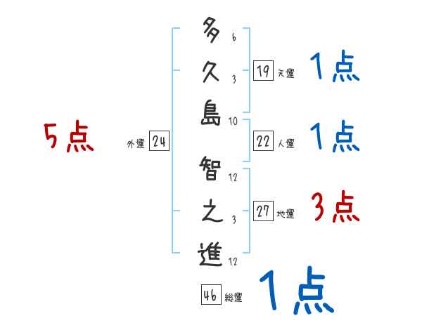 天運![]() | 多久島智之進さんの天運は19画の1つ星!優れた才能を持ちますが、協調性が足りないことも。周りの人と協力する事を意識しましょう。 家系が持つ宿命的な運勢を表します。祖先から受け継いだ苗字ですので自分の力が及びません。家柄を象徴します。 |