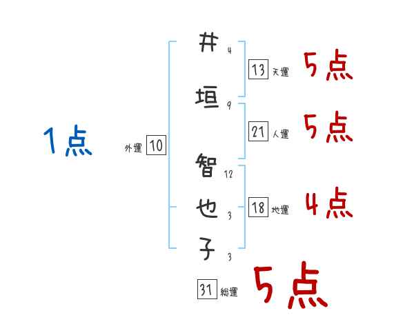 外運![]() | 井垣智也子さんの外運は10画の1つ星!不安を感じやすい傾向。ストレスを抱えないように注意しましょう。 生活面を象徴する運勢です。外部から受ける影響力を表し、結婚運、家庭運や職場、環境への順応性を表します。 |