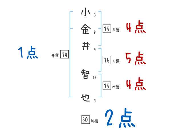 人運![]() | 小金井智也さんの人運は16画の5つ星!人望が厚く大きく発展する。逆転成功が見える。 性格や才能などを表す2番目に重要な運勢です。人間関係や協調性、社会的な成功に影響します。主に20歳から50歳ぐらいまでの中年期の運勢を表します。 |
