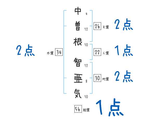 天運![]() | 中曽根智亜気さんの天運は26画の2つ星!波瀾万丈かも。信頼できる人を大事にしましょう。 家系が持つ宿命的な運勢を表します。祖先から受け継いだ苗字ですので自分の力が及びません。家柄を象徴します。 |