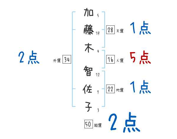人運![]() | 加藤木智佐子さんの人運は16画の5つ星!人望が厚く大きく発展する。逆転成功が見える。 性格や才能などを表す2番目に重要な運勢です。人間関係や協調性、社会的な成功に影響します。主に20歳から50歳ぐらいまでの中年期の運勢を表します。 |
