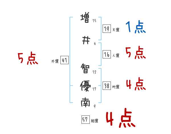 総運![]() | 増井智優南さんの総運は57画の4つ星!向上心があり人望がある。地位を得る。 あなたの人生を表す1番重要な運勢です。生涯を通じて影響する総合運となり、主に50歳以降の晩年期に影響を及ぼします。 |