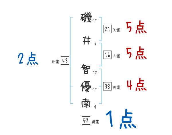 外運![]() | 磯井智優南さんの外運は43画の2つ星!頑固な性格で独立心が強いかも。やや非現実的で浪費に注意しましょう。 生活面を象徴する運勢です。外部から受ける影響力を表し、結婚運、家庭運や職場、環境への順応性を表します。 |
