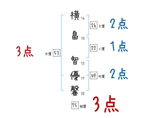 外運![]() | 横畠智優馨さんの外運は53画の3つ星!やや見栄っ張りで虚栄心がある。散財に注意。 生活面を象徴する運勢です。外部から受ける影響力を表し、結婚運、家庭運や職場、環境への順応性を表します。 |
